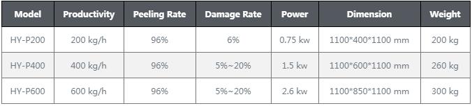 Model Productivity Peeling Rate Damage Rate Power Dimension Weight